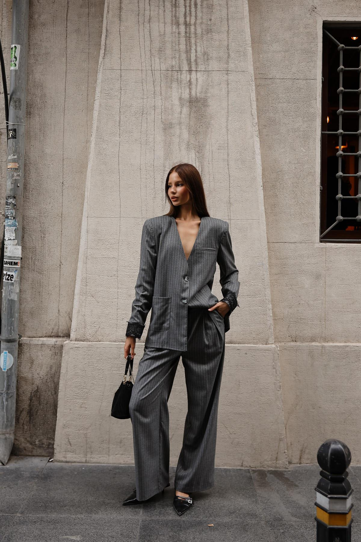 ÇİZGİ DESEN DANTEL DETAYLI OVERSİZE CEKET - Gri (39186)
